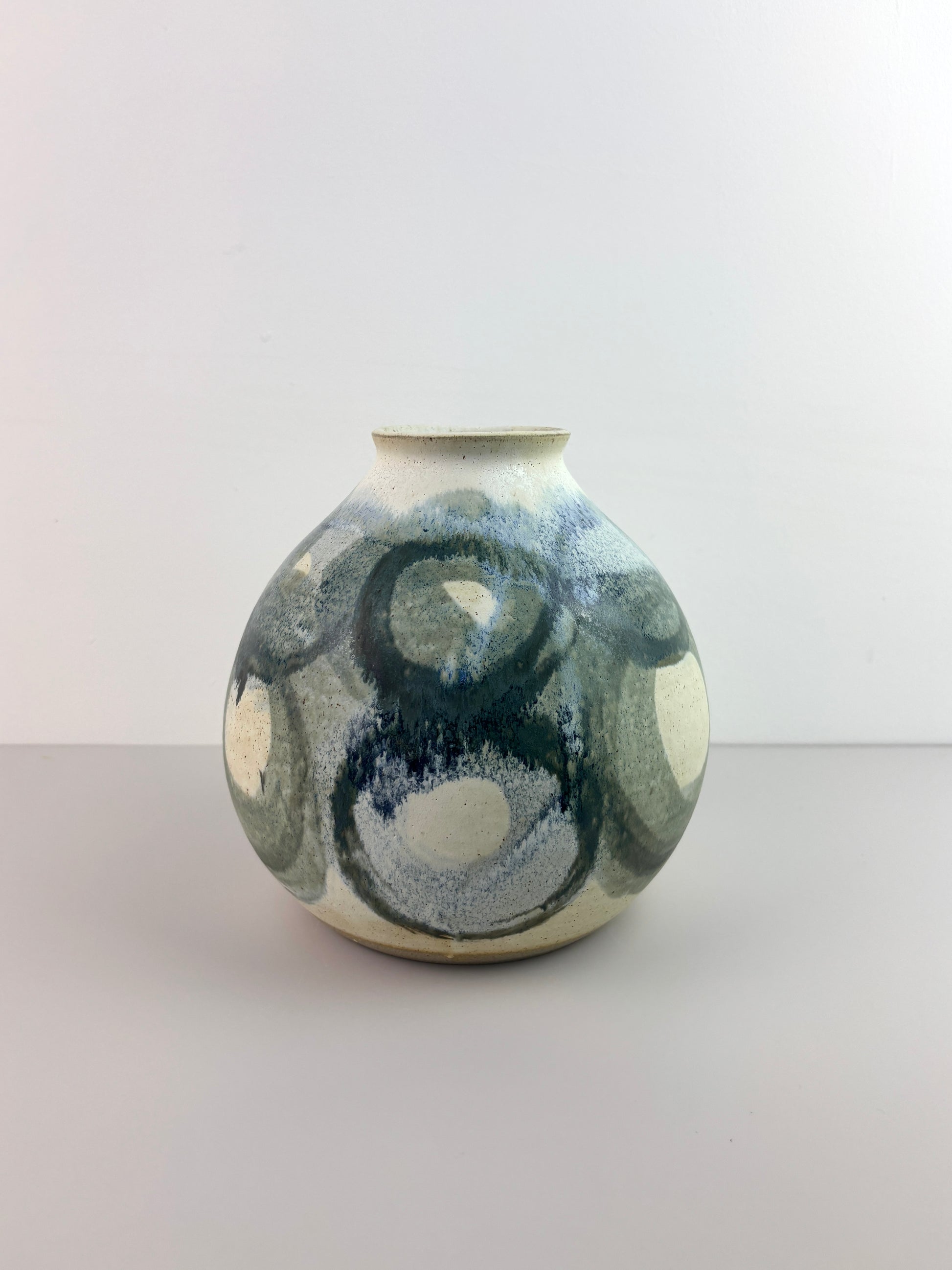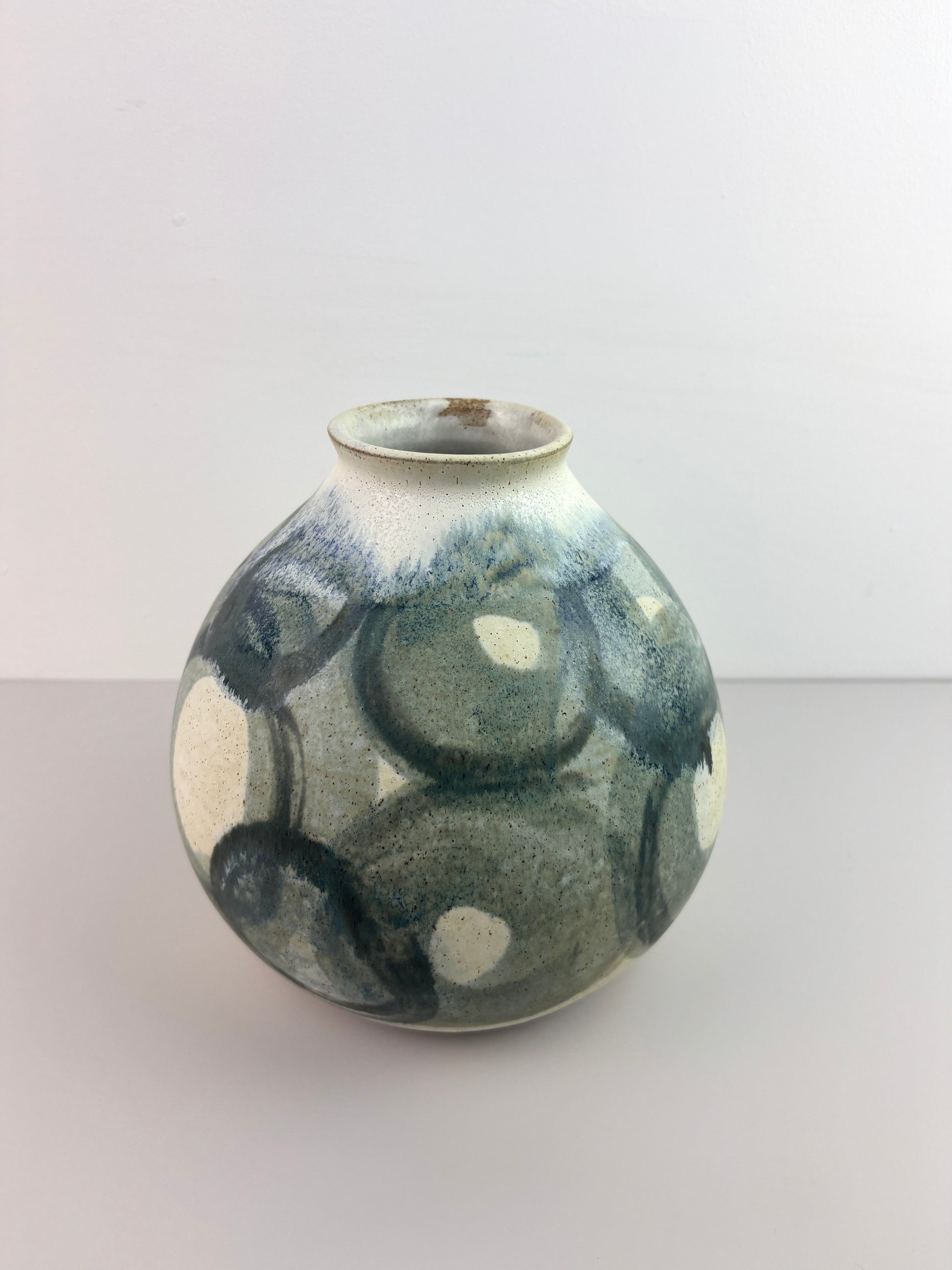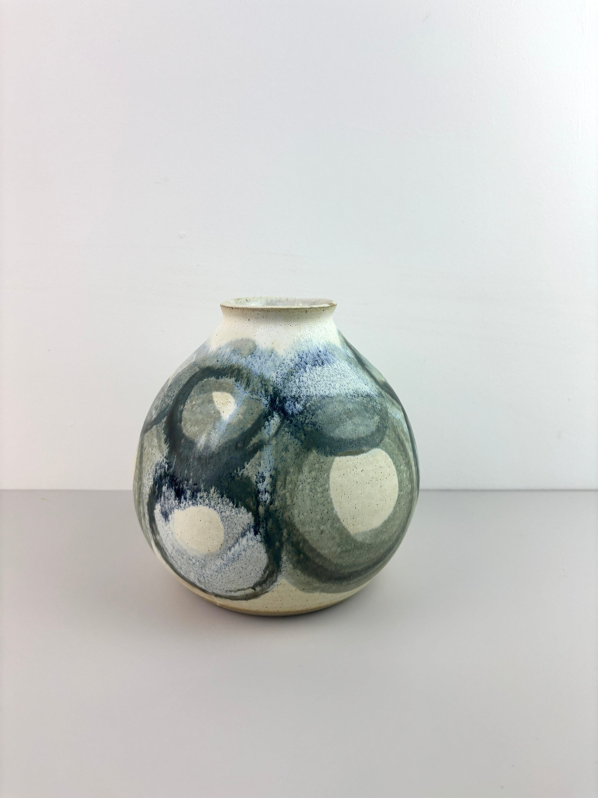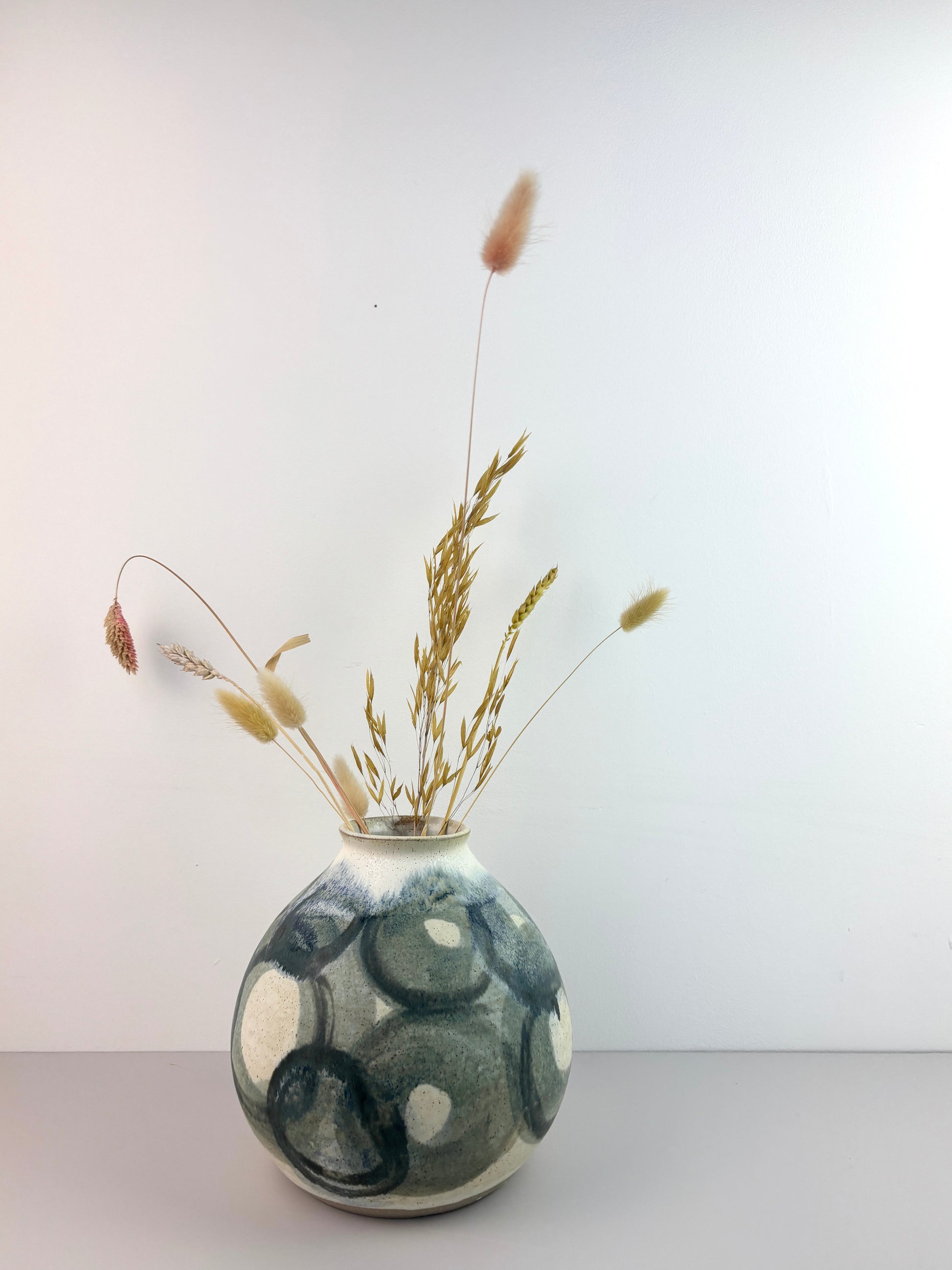 A large vase with overlapping circles in blue and green colours. Perfect to use for flowers.