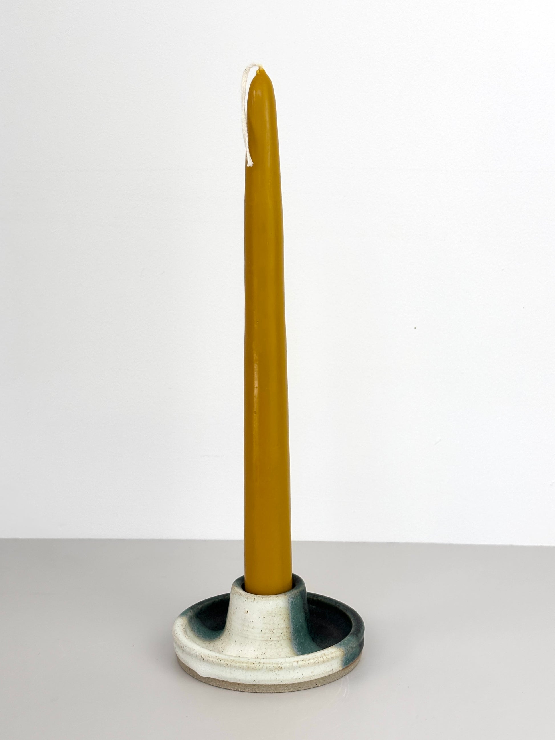 Candle holder in overlapping cream/sand and deep green with a line of light green where the colours meet. (Candles not included)