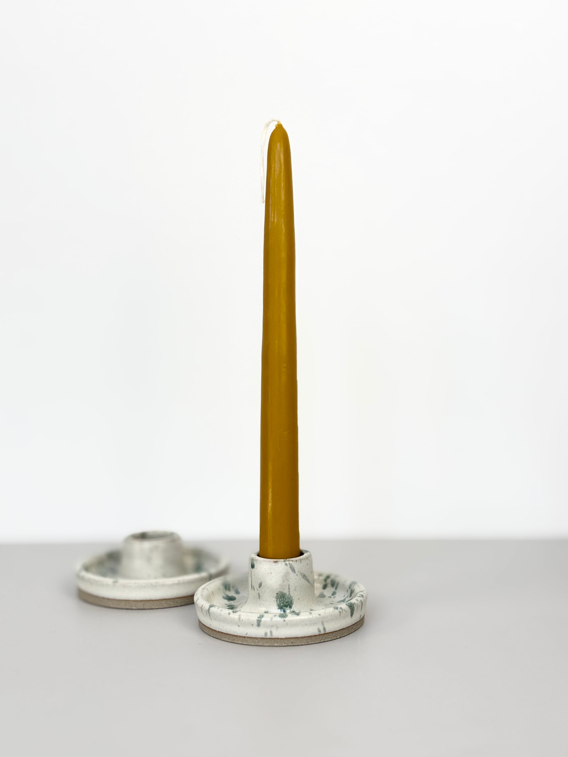 Matching candle holders. Matt white with green speckle detail. 8.7cm wide. (Candles not supplied)