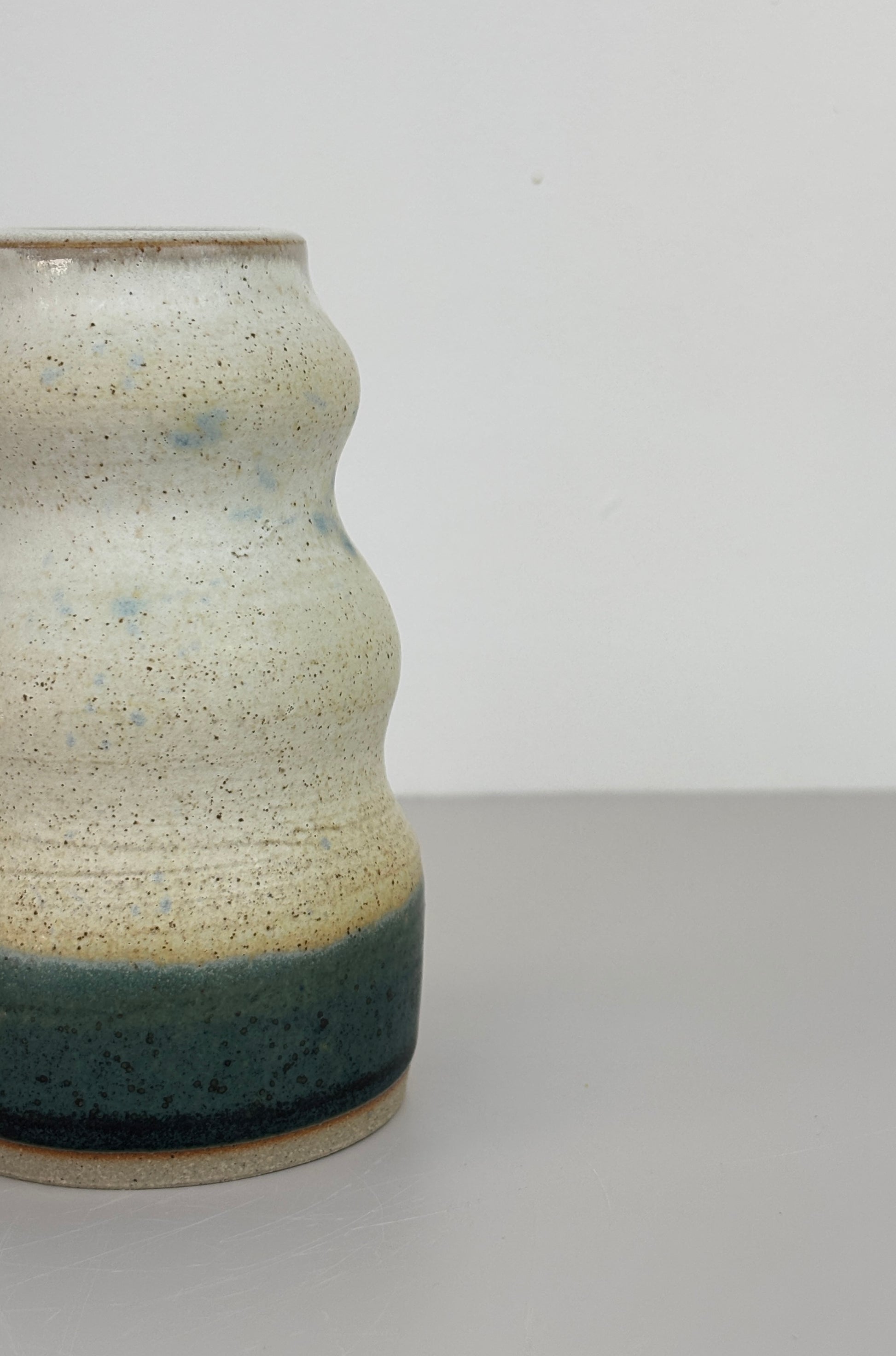 A curvaceous flower jug in green and cream overlapping glaze and subtle splash detail