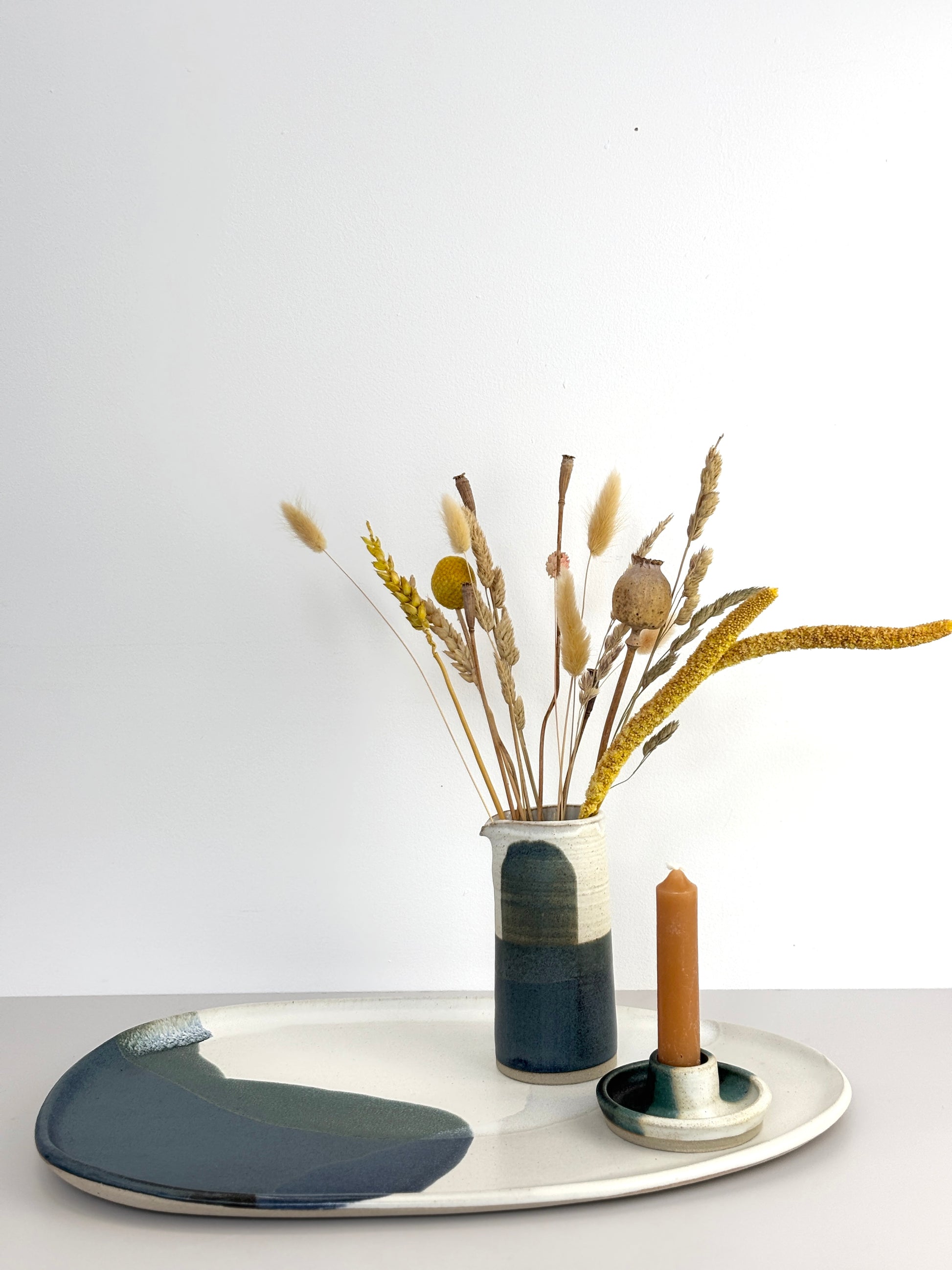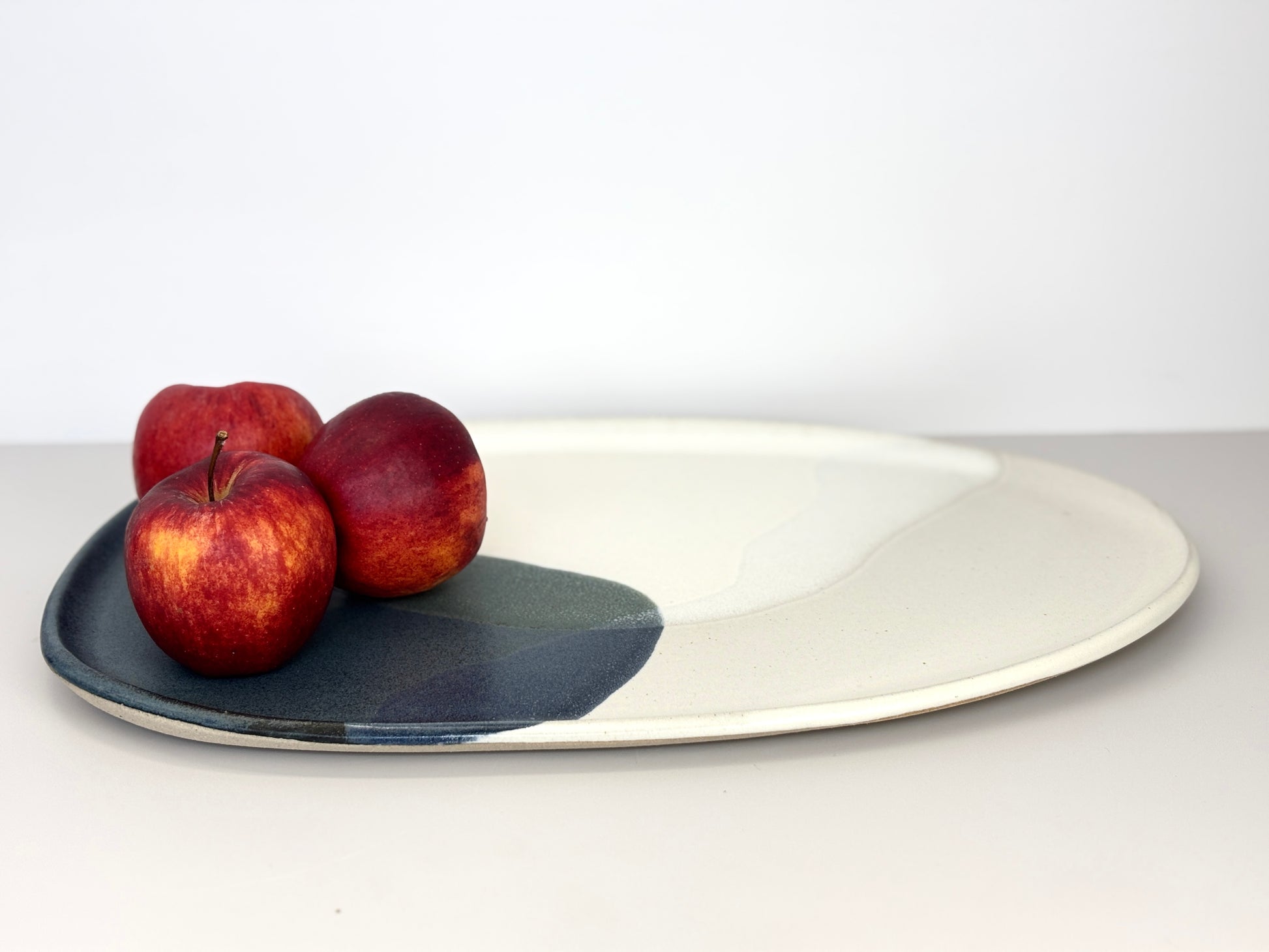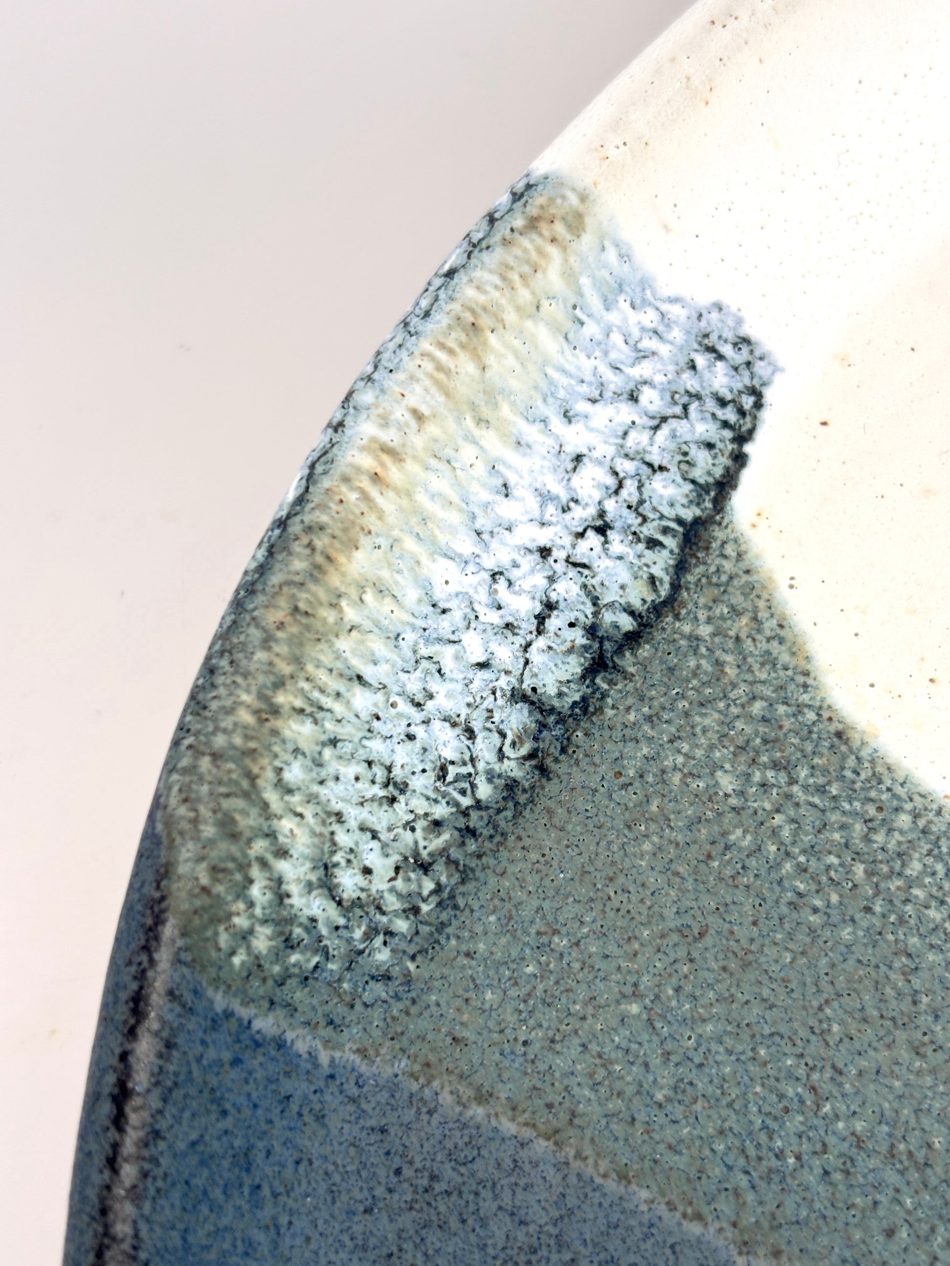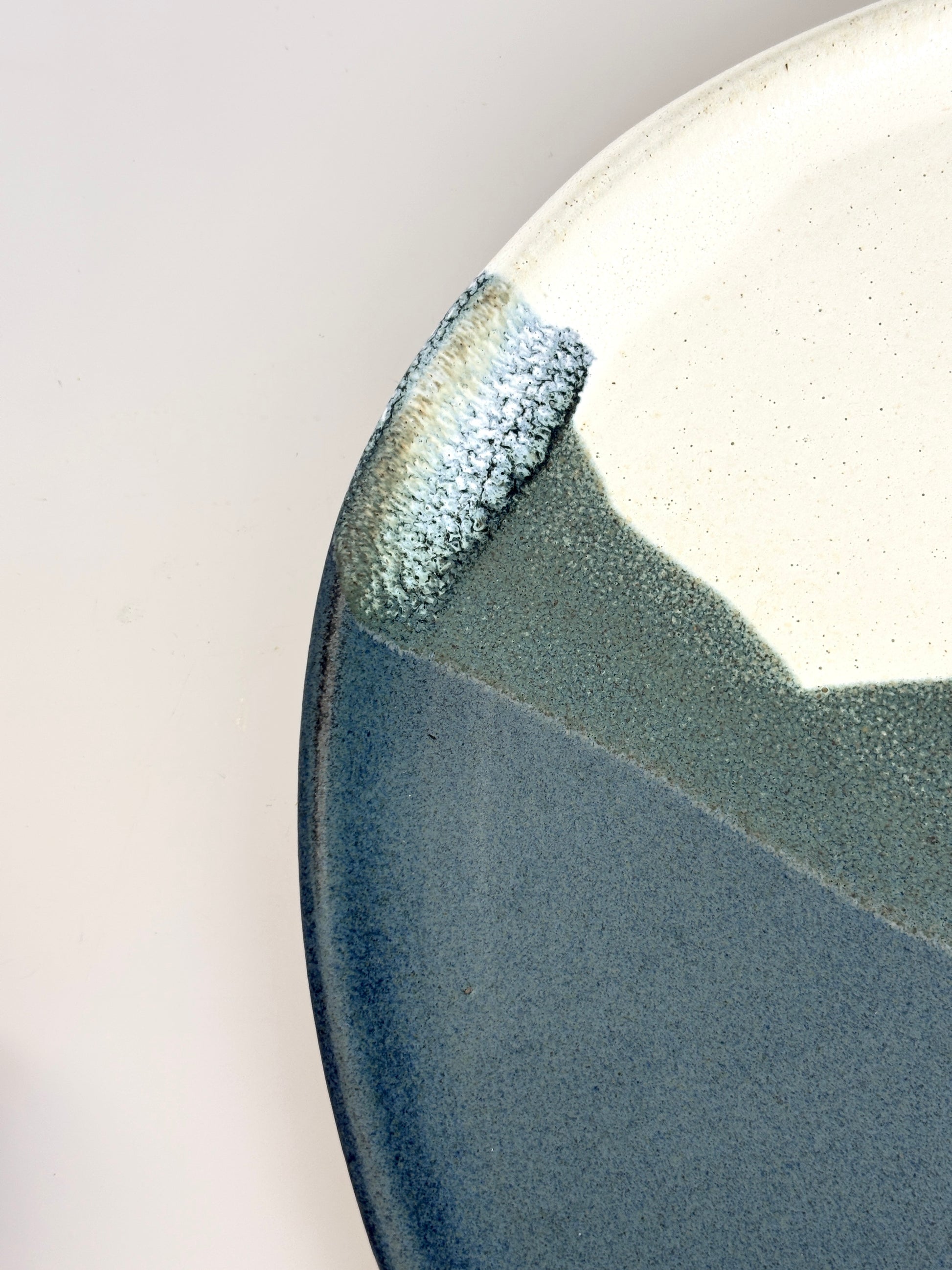 A large platter in overlapping white, cream, blue and green. Some lovely areas of kiln magic where the glaze has reacted with on another. Price is for platter only. Some images show decoration with additional ceramic pieces.