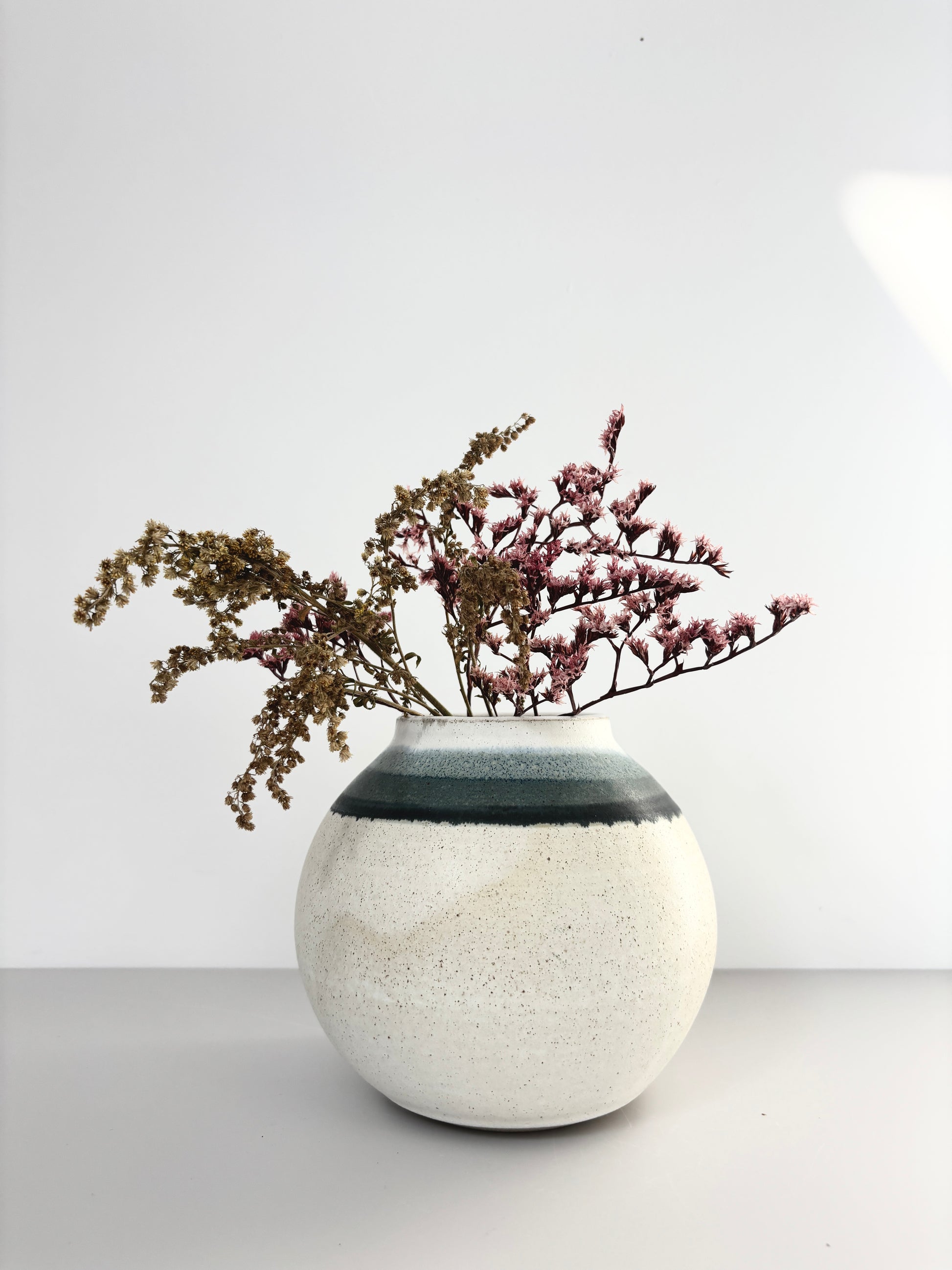 A beautiful form with off matt white base glaze decorated with a band of light blue and green. This vessel has a strong contrast between the oxide and pale glaze.