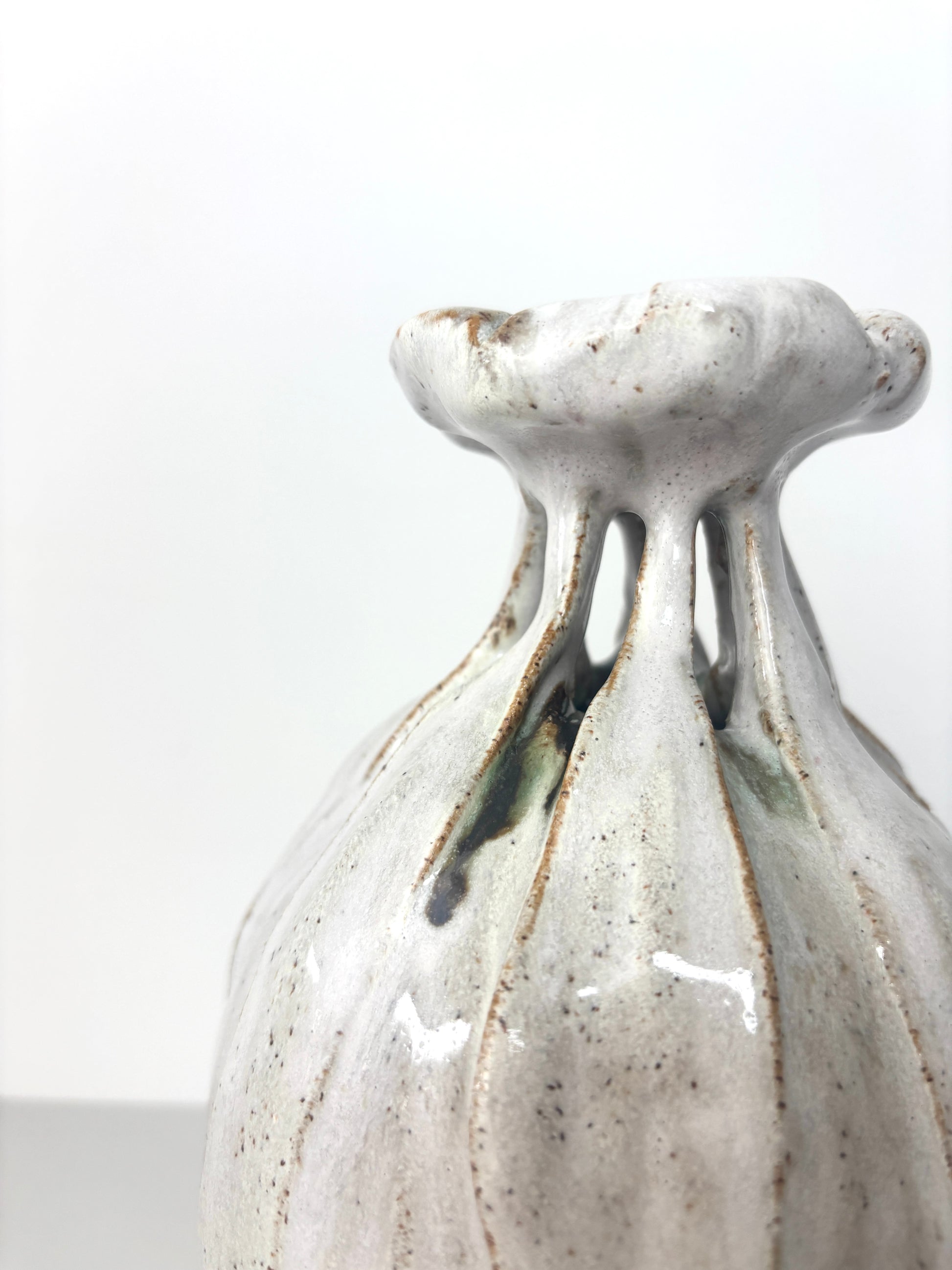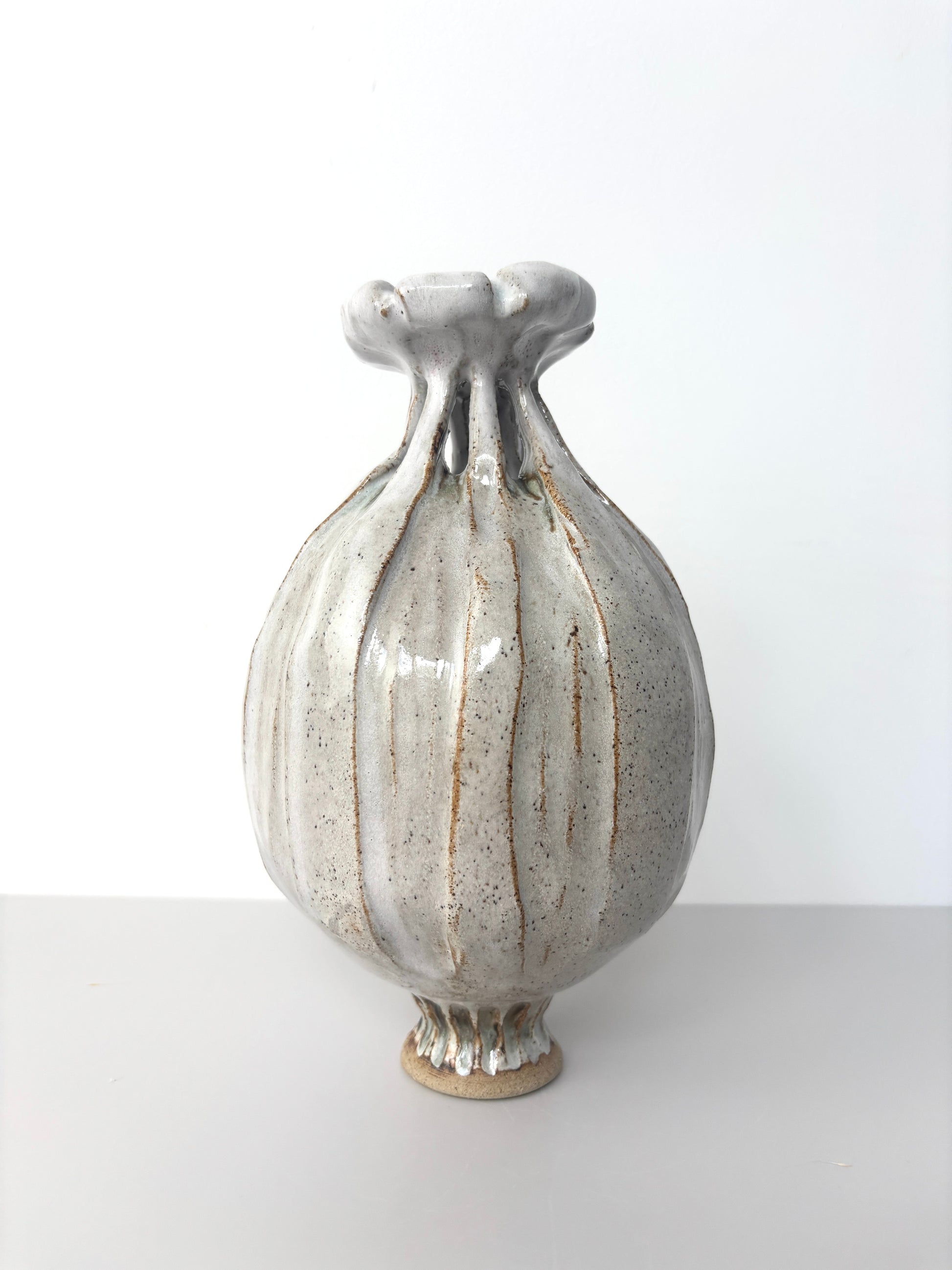 An enlarged sculptural interpretation of a poppy seed head, finished in a softly speckled glaze with delicate touches of green oxide.