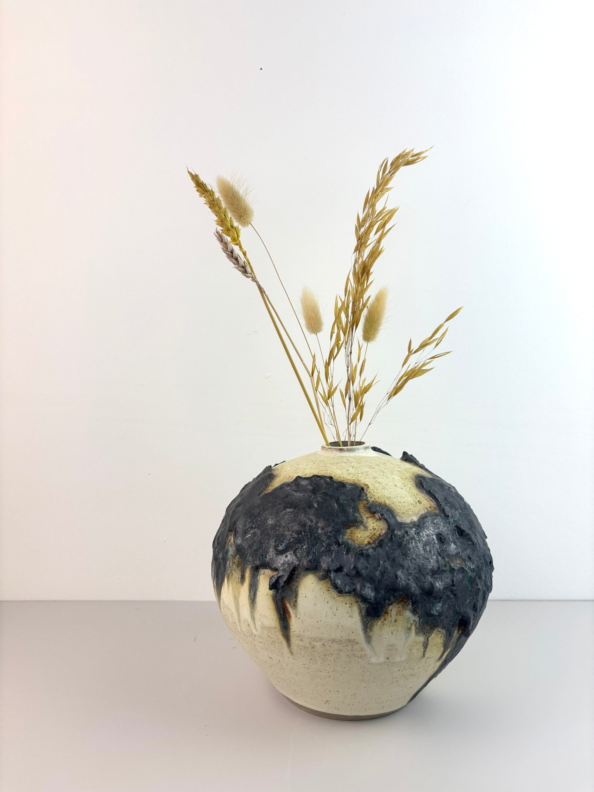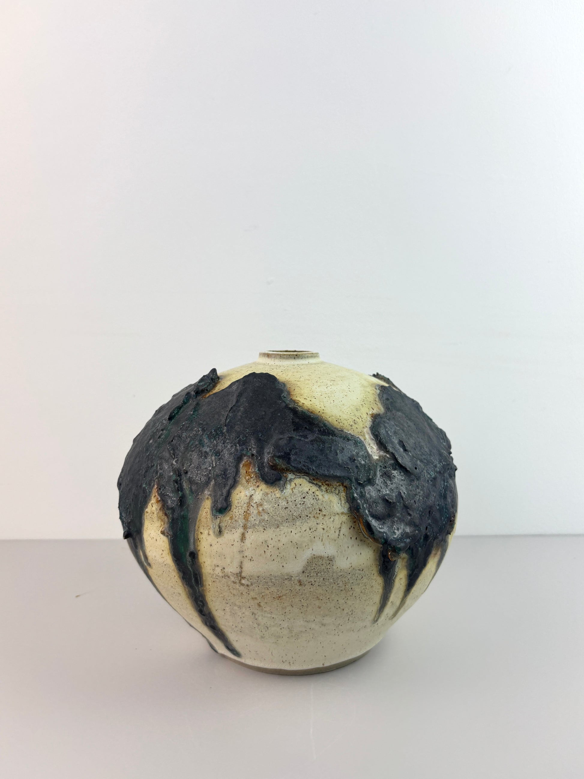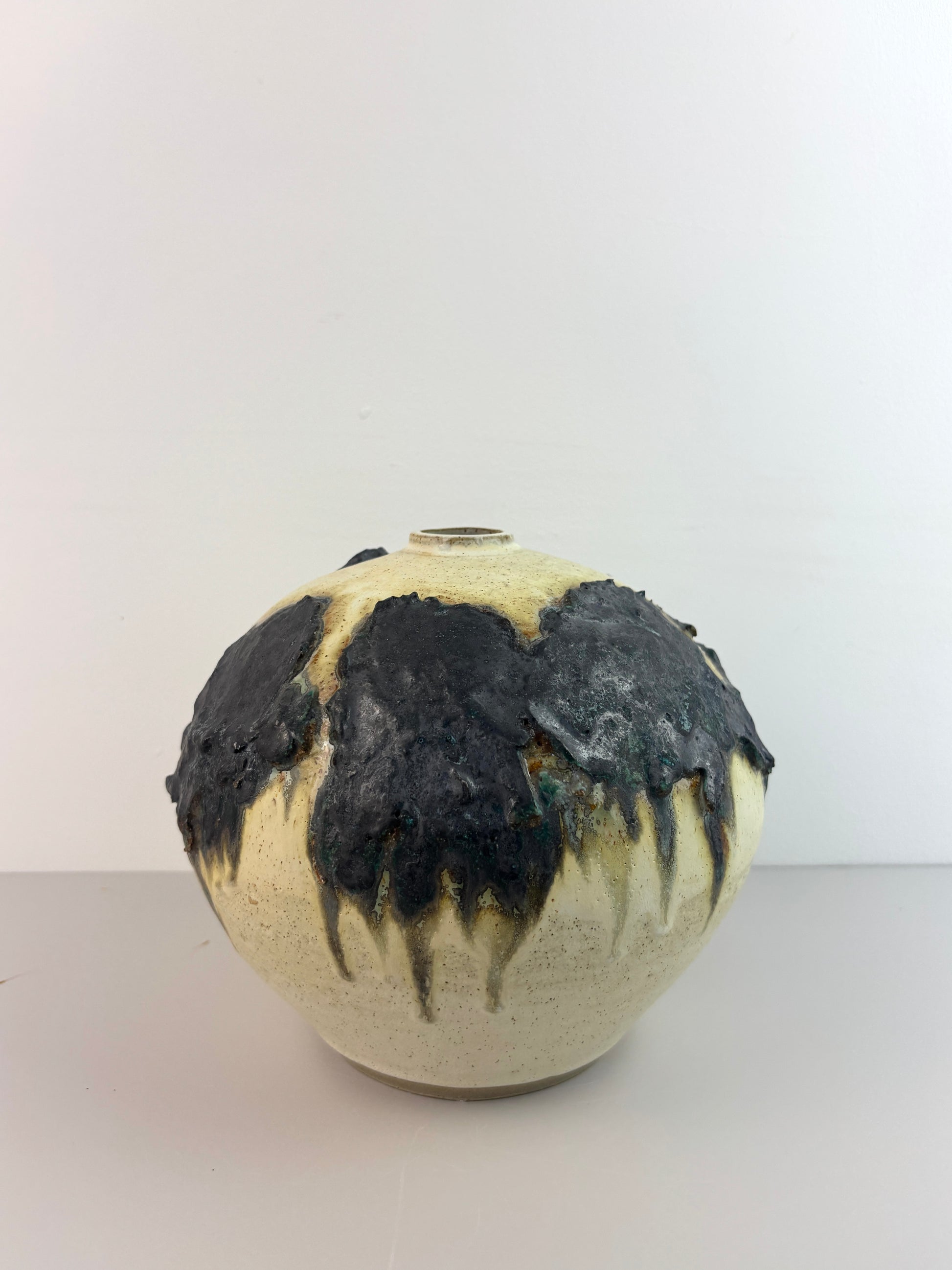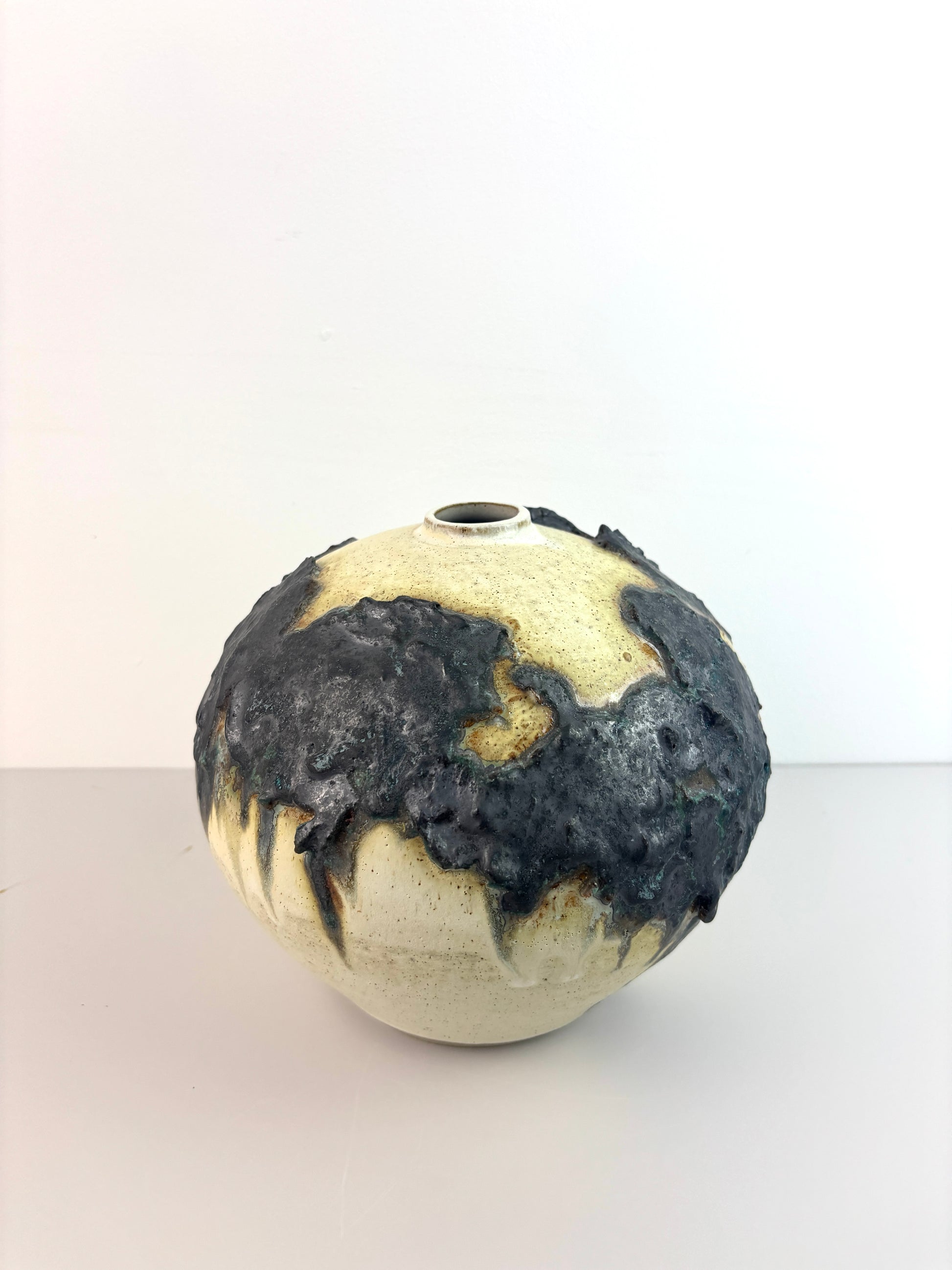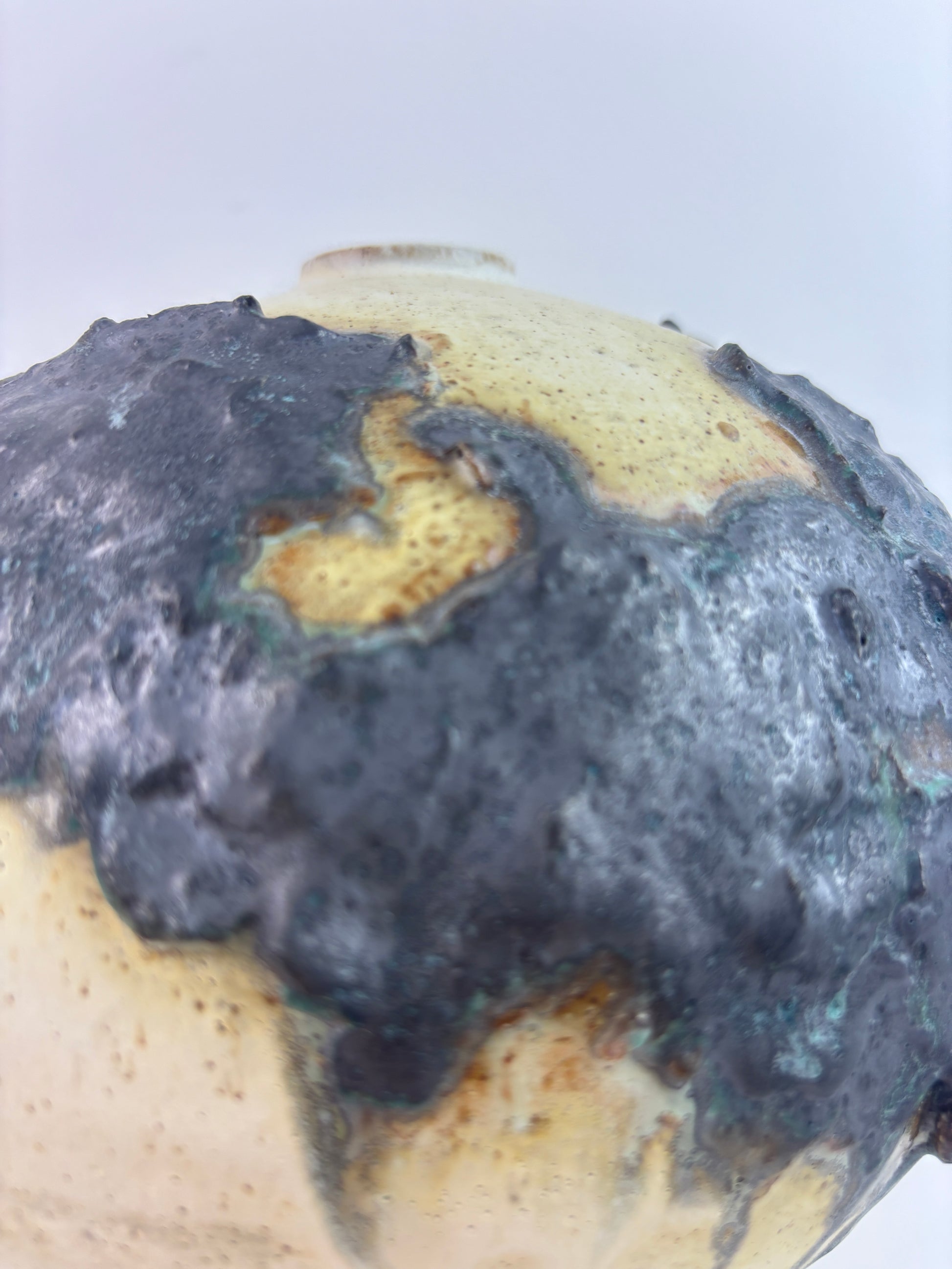 An experimental glaze inspired by the industrial heritage of the North East, featuring a striking blend of metallic tones, rich browns, and vivid electric blue-green. Layered textured slip sits over my signature sand-coloured base glaze, creating a unique, tactile finish that celebrates both grit and beauty.