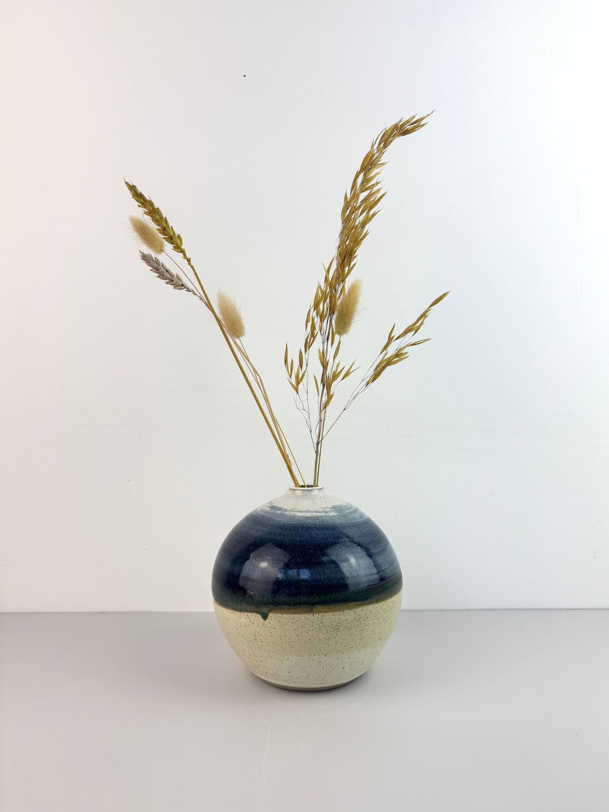 A summer bay vessel featuring a matte sand-coloured base complemented by a glossy blue band that adds a contrasting element.