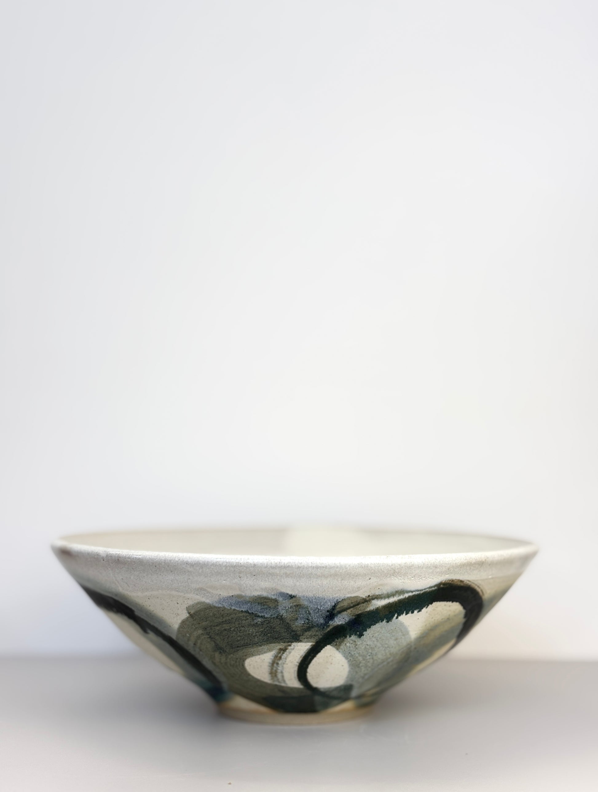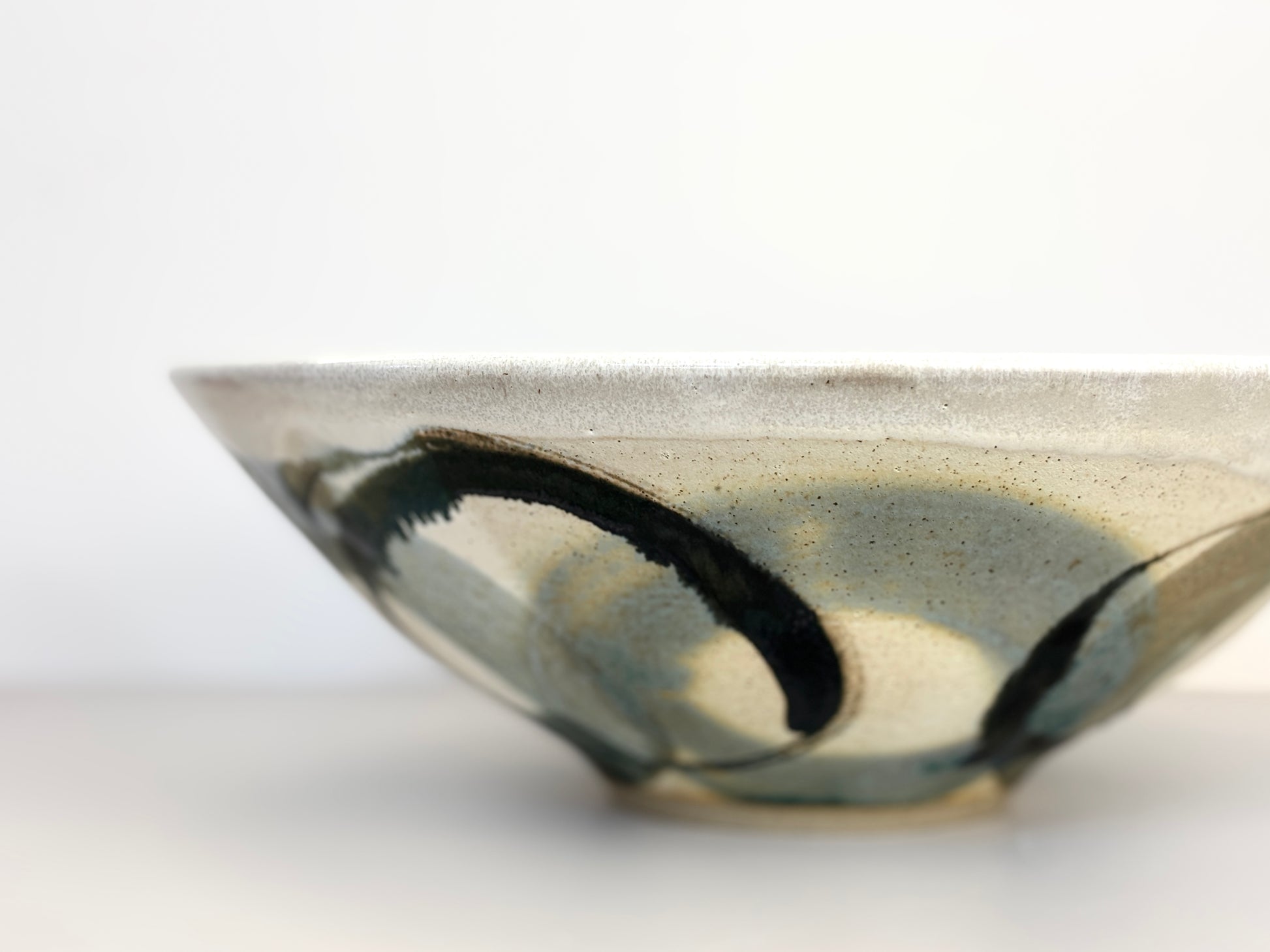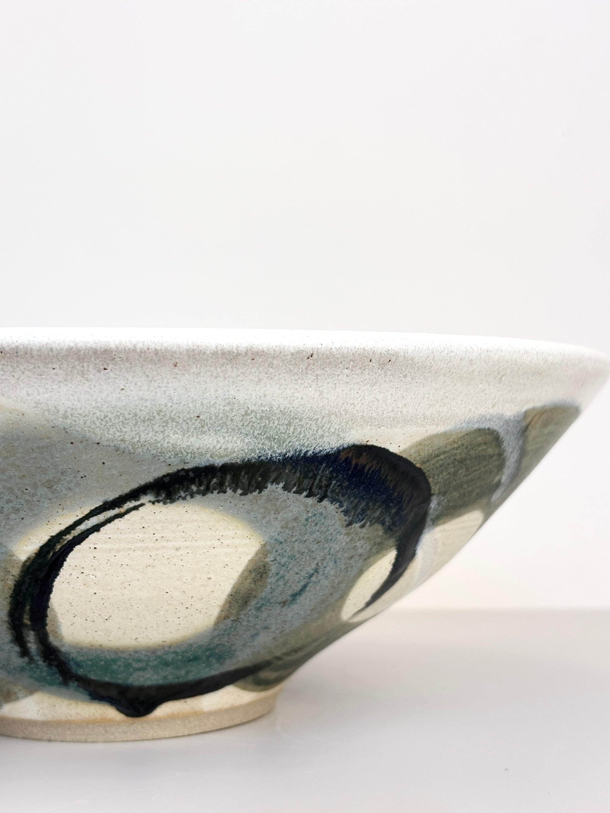 Large Bowl featuring large overlapping circles in blue and green colours. A thin black circle ads contract to some beautiful glaze reactions.